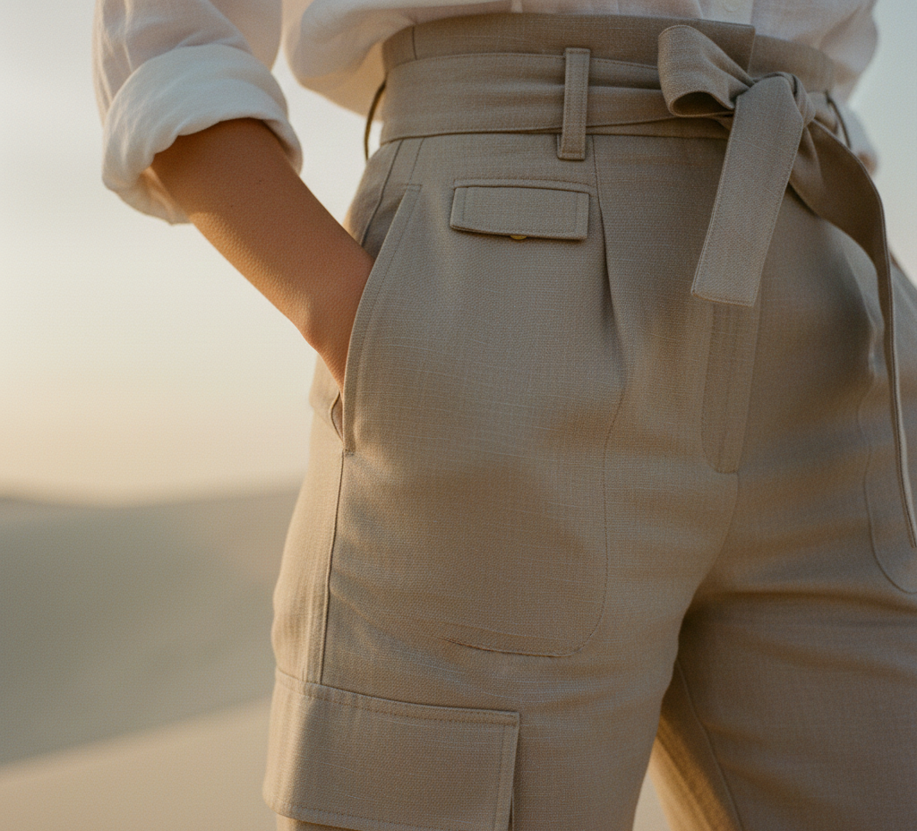 Measurements are taken flat and unstretched. Slight variations may occur due to hand finishing and fabric. Designed to sit comfortably at the waist and move with you.